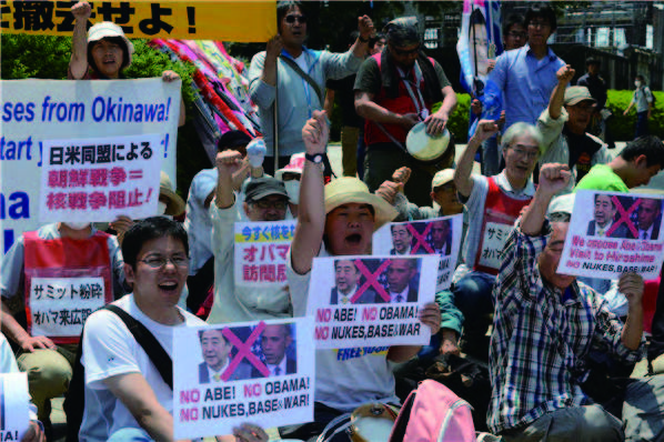 基地があるゆえにまたも繰り返された残虐きわまりない女性暴行殺害事件に対して、沖縄では「全基地を撤去せよ!」の怒りが爆発しています。しかしオバマは日米首脳会談で「謝罪」は拒否し、圧倒的多数の沖縄県民が反対する辺野古への基地建設をあくまで推進すると言い放っているのです。そしてオバマは本日、沖縄海兵隊と一体の岩国基地に降り立ち、そこで朝鮮侵略戦争の最前線部隊である岩国の海兵隊航空部隊を最高司令官として「激励」して、広島にやってくるのです。ヒロシマ・ナガサキとならぶ戦争の惨禍を強制され、戦後も戦争=核戦争のための巨大な米軍基地が置かれ続け、爆音、事件・事故の脅威に日々さらされている沖縄。この沖縄の「すべての基地をなくせ! 戦争絶対反対!」の叫びは、「ヒロシマ・ナガサキを繰り返すな!」の叫びと一つだったのではありませんか。 沖縄と共にヒロシマからオバマに怒りの声を上げる時です。